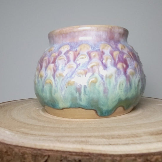 Dette unike kruset er håndlaget i steingods og glasert med lag på lag av myke blå-, lilla- og sandfargede toner som minner om havets bevegelse og skimrende skjell. Glasuren flyter naturlig under brenning, noe som gjør hvert krus helt unikt – ingen blir helt like.