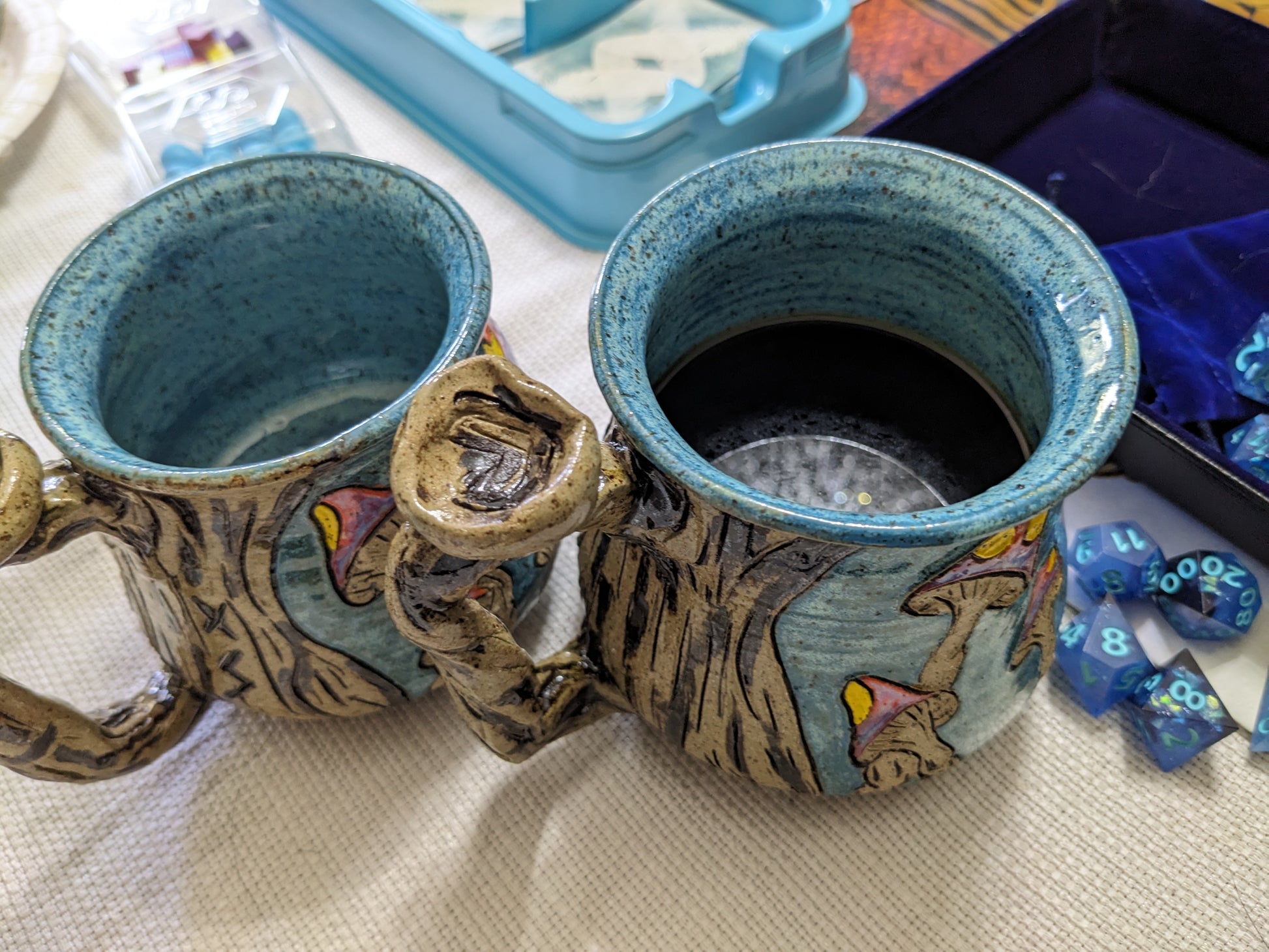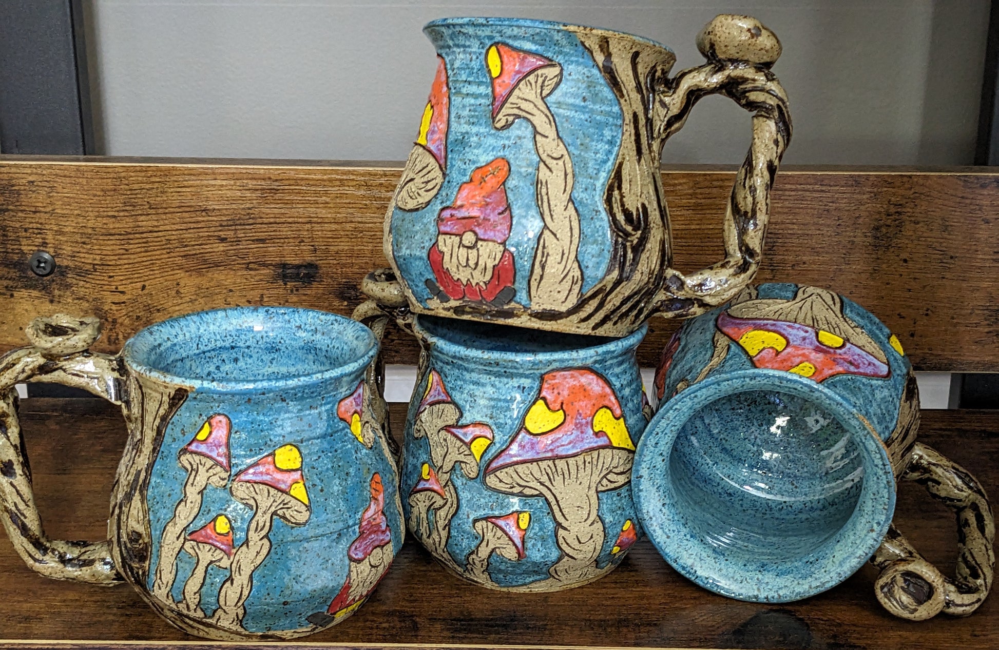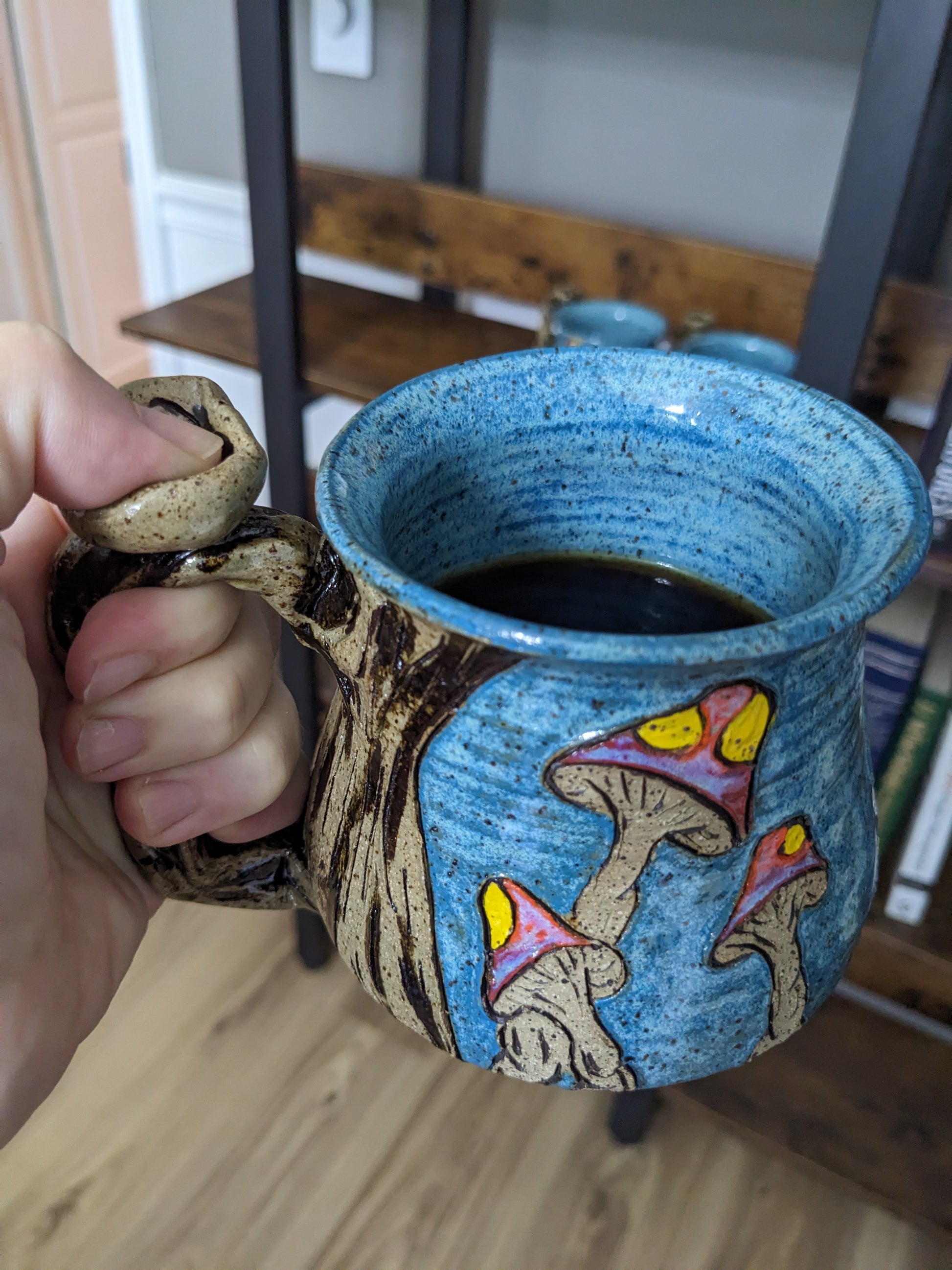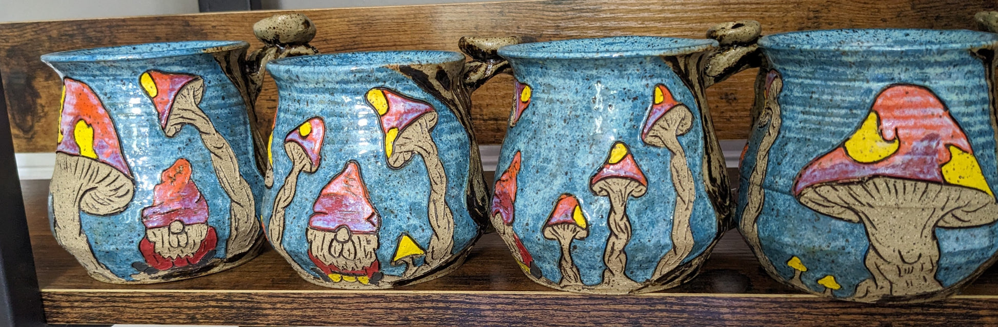 Superkult håndlaget, håndskåret og håndmalt keramikkrus. Dette er favorittkruset mitt å lage! Jeg elsker de livlige kontrastfargene i den blå bakgrunnen og de lyse soppene. Håndtaket er veldig komfortabelt, og det er en liten gnom som prøver å gjemme seg som en sopp. Selvfølgelig tåler all keramikken min mikrobølgeovn, stekeovn og oppvaskmaskin.