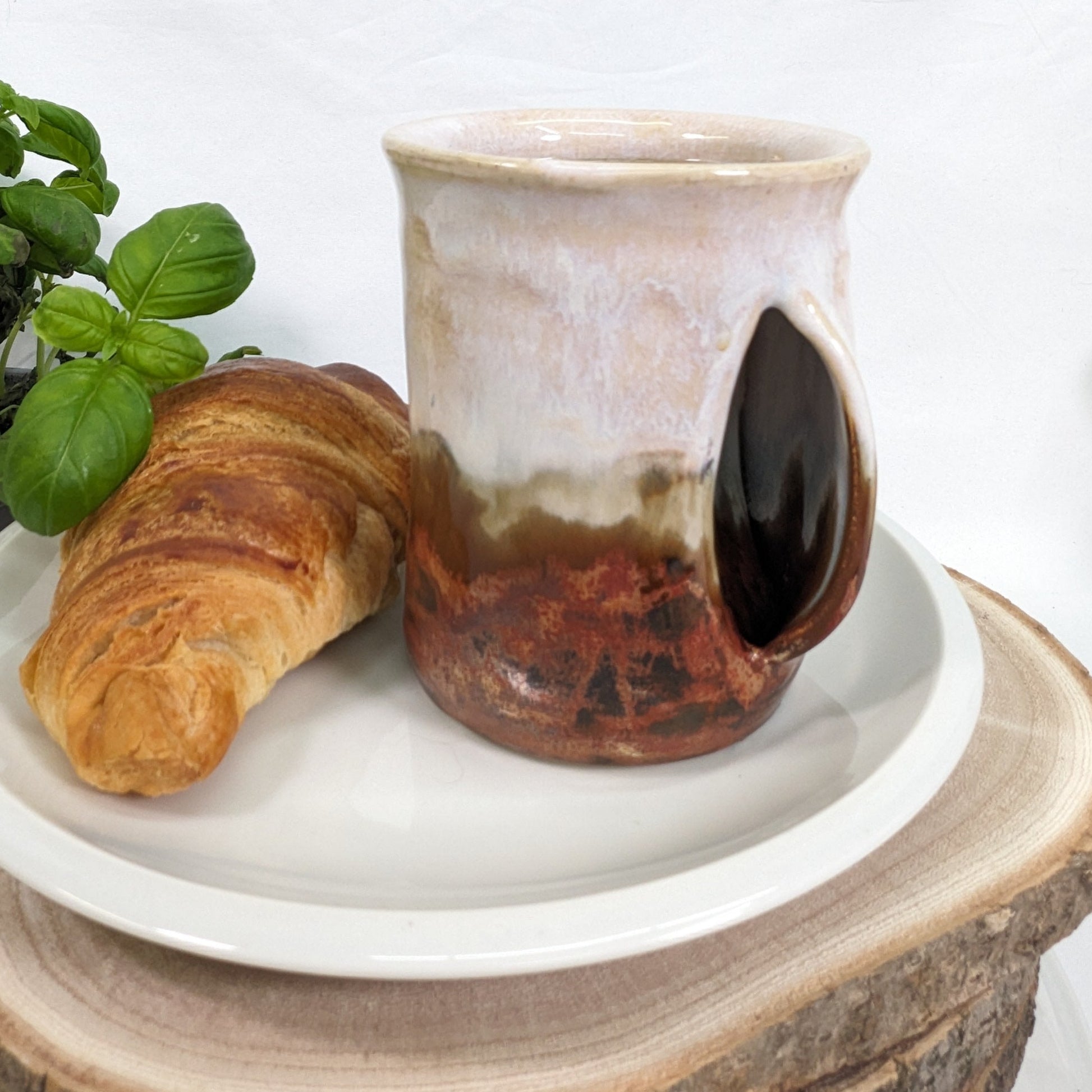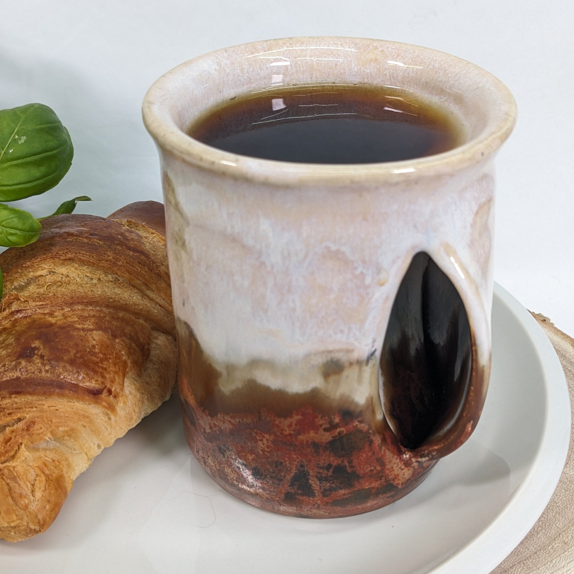 Denne håndlagde keramiske koppen er designet med en skulpturert tommelstøtte og plass til én eller to fingre for å holde koppen komfortabelt.