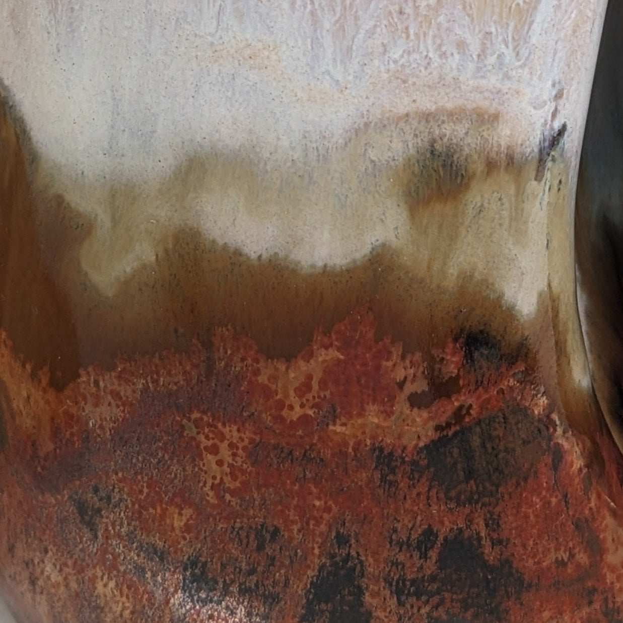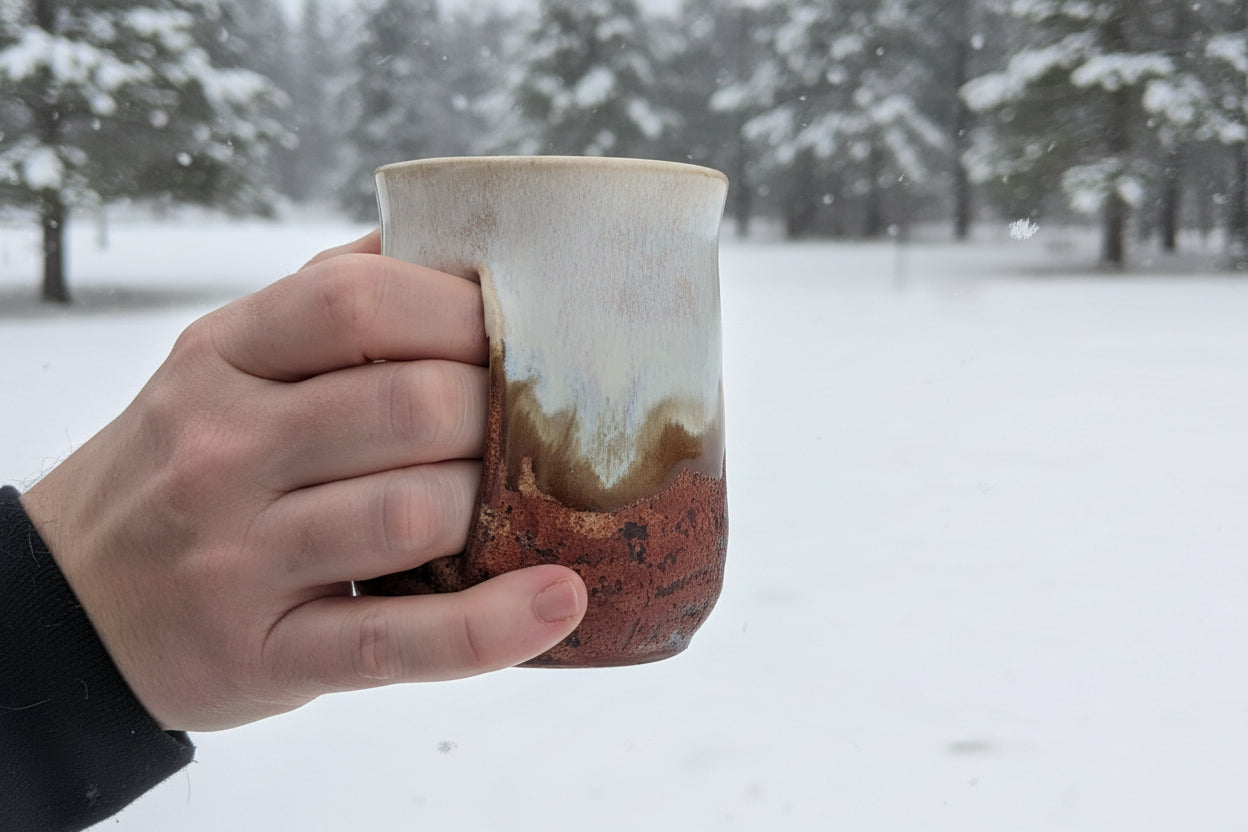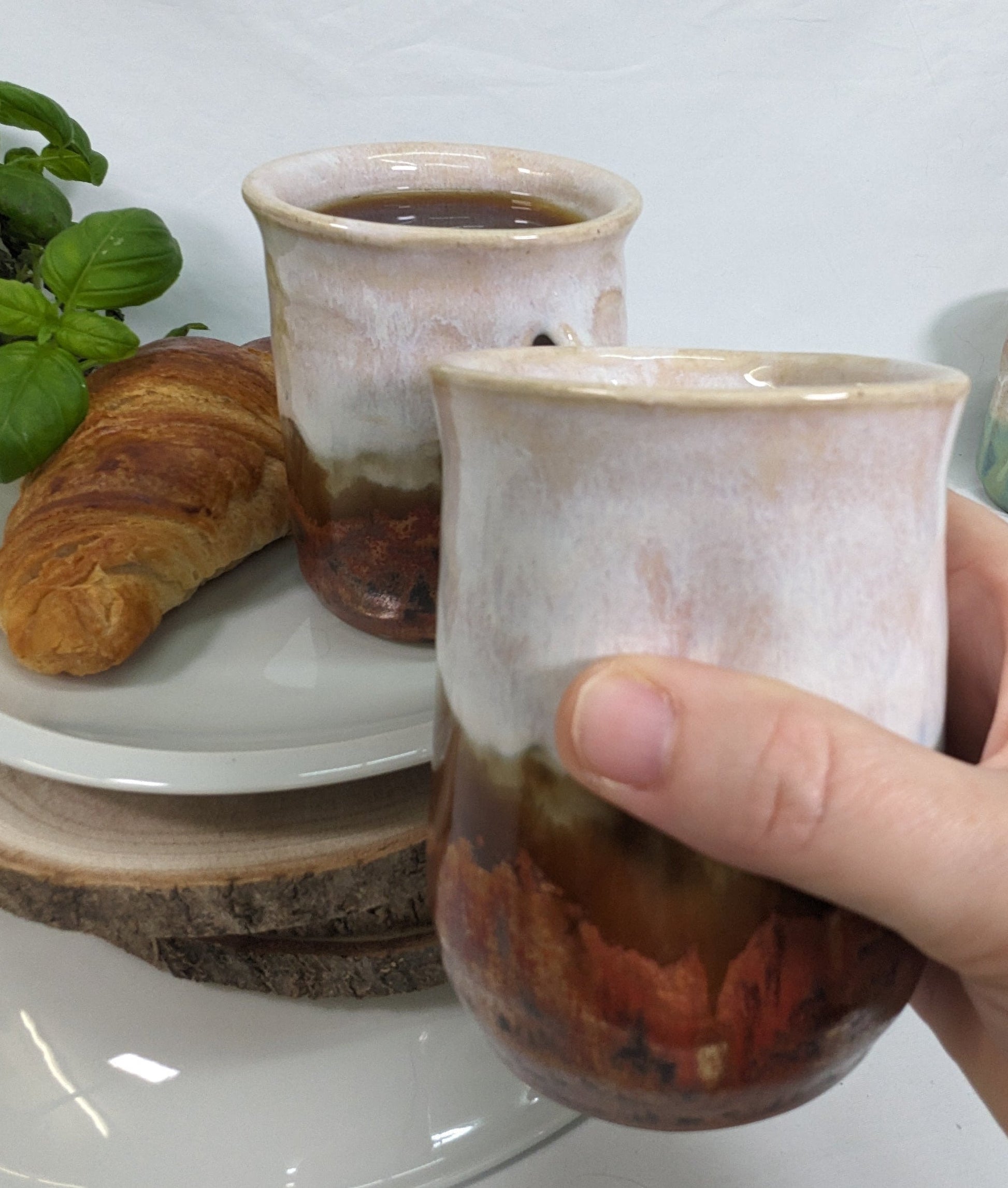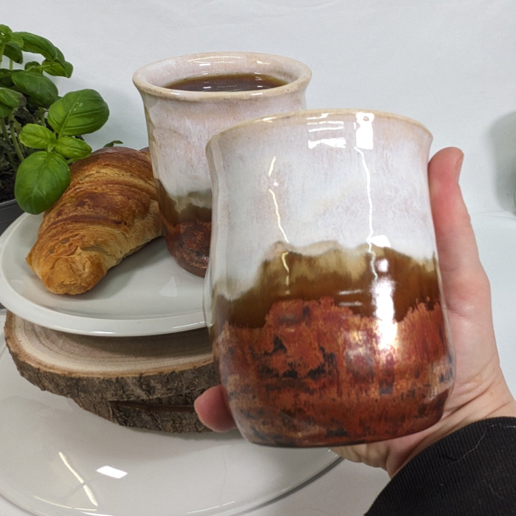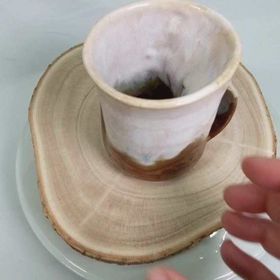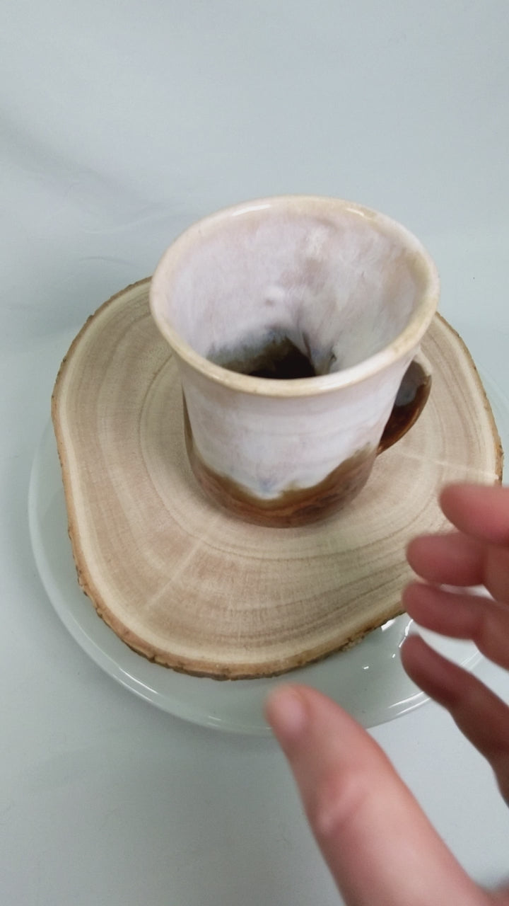 Laget med lagdelte, jordaktige glasurer i myke kremfarger, gyllenbrune og dype jordaktige rødfarger. Fargene blandes sammen for en naturlig, rustikk finish som gjør hver kopp unik.